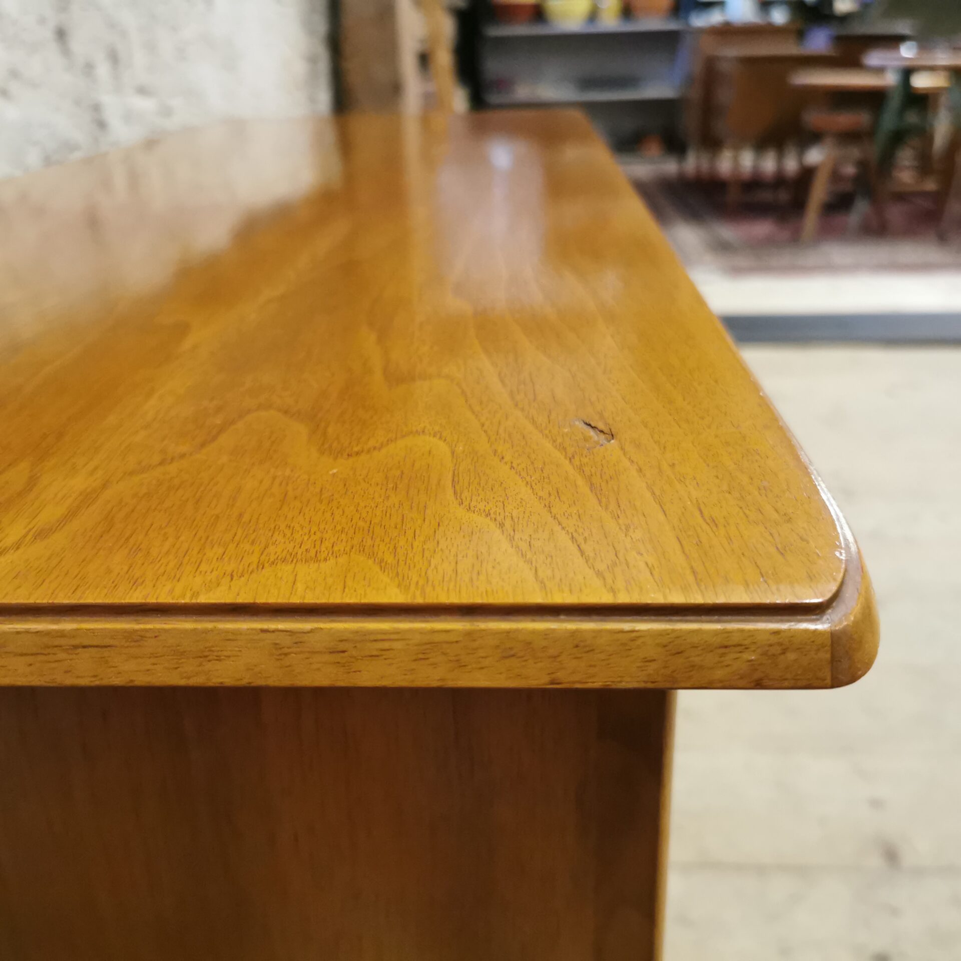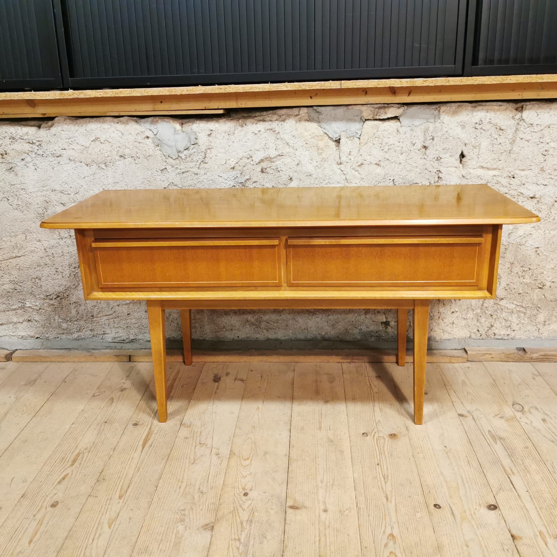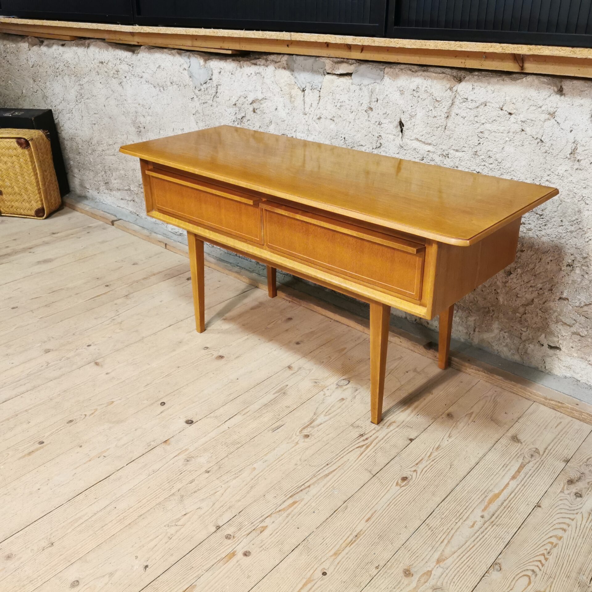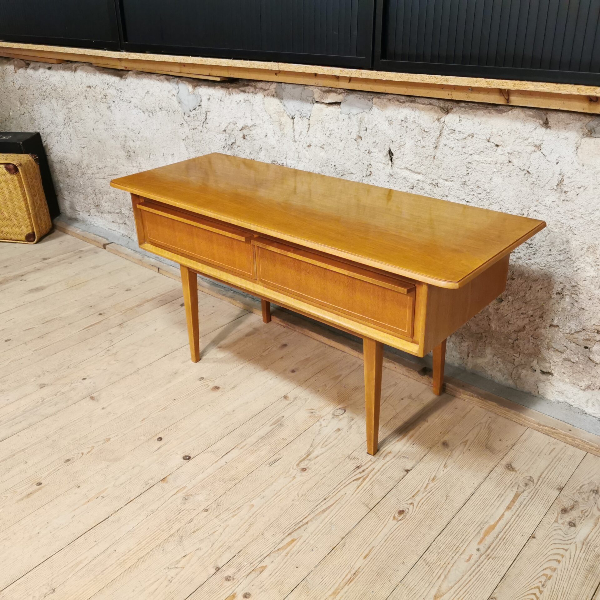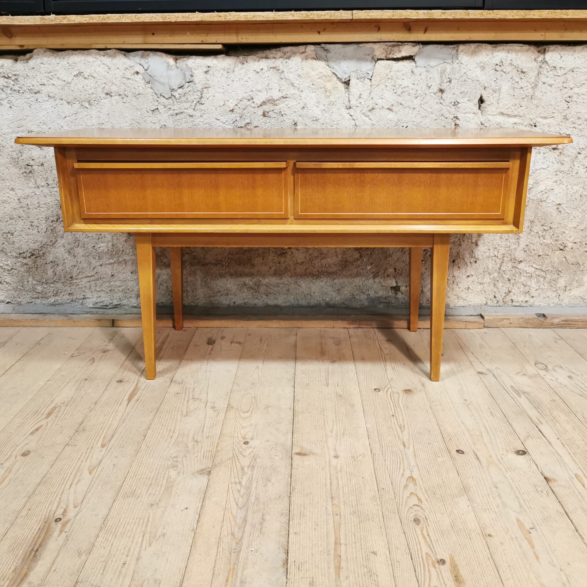 In einem hellen, ansprechenden warmen Farbton. Was für ein elegantes Möbel auf langen konischen Beinen. Dieses Beistelltischchen mit zwei Schubladen repräsentiert die Sechzigerjahre von seiner individuellen Seite. Ein seltenes Fundstück mit viel Charm.