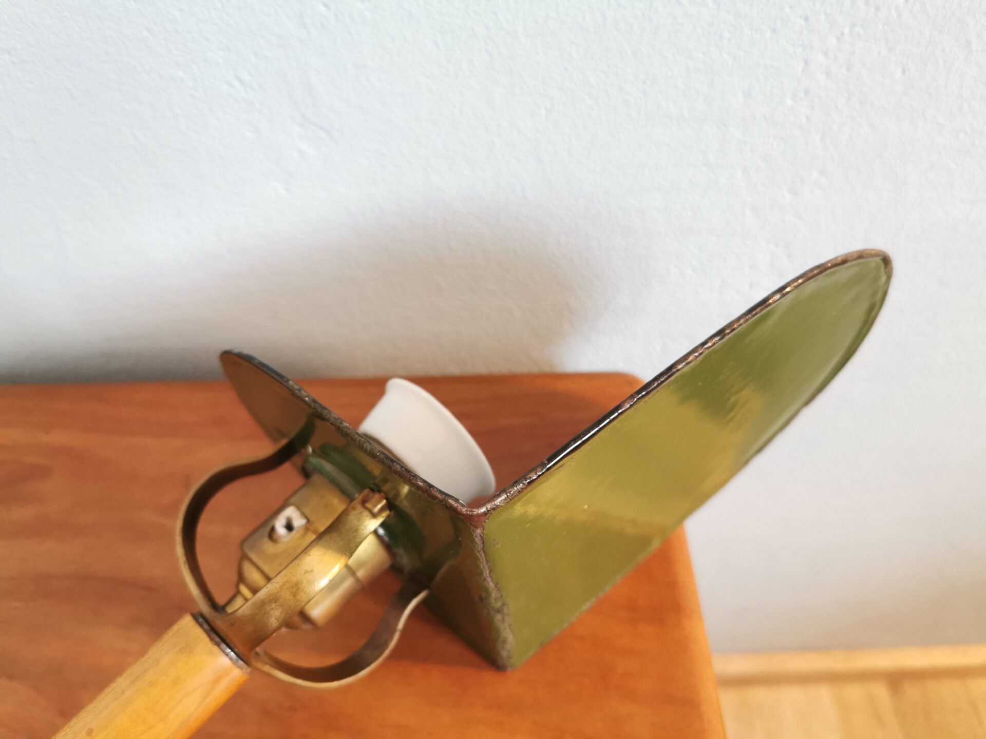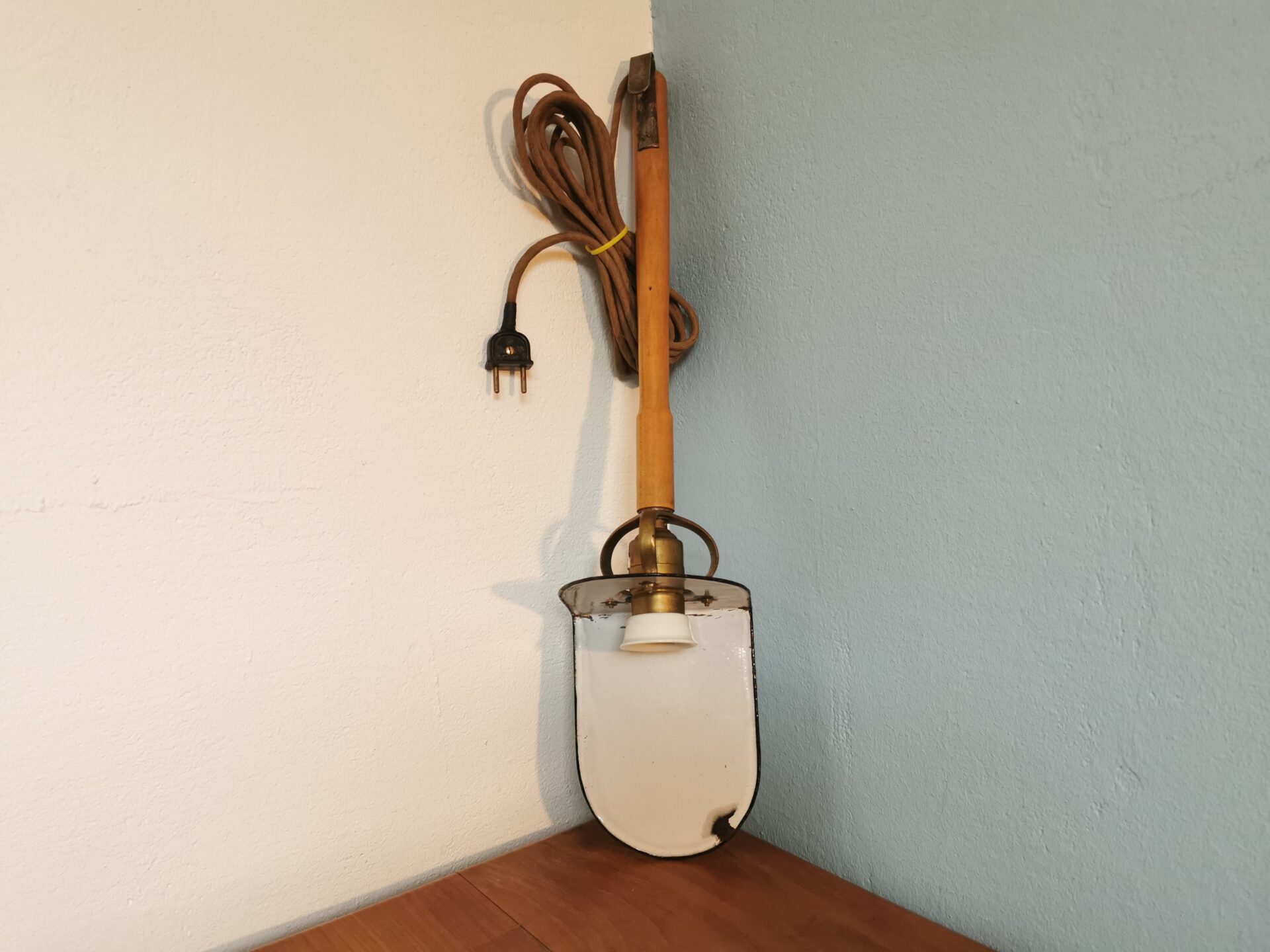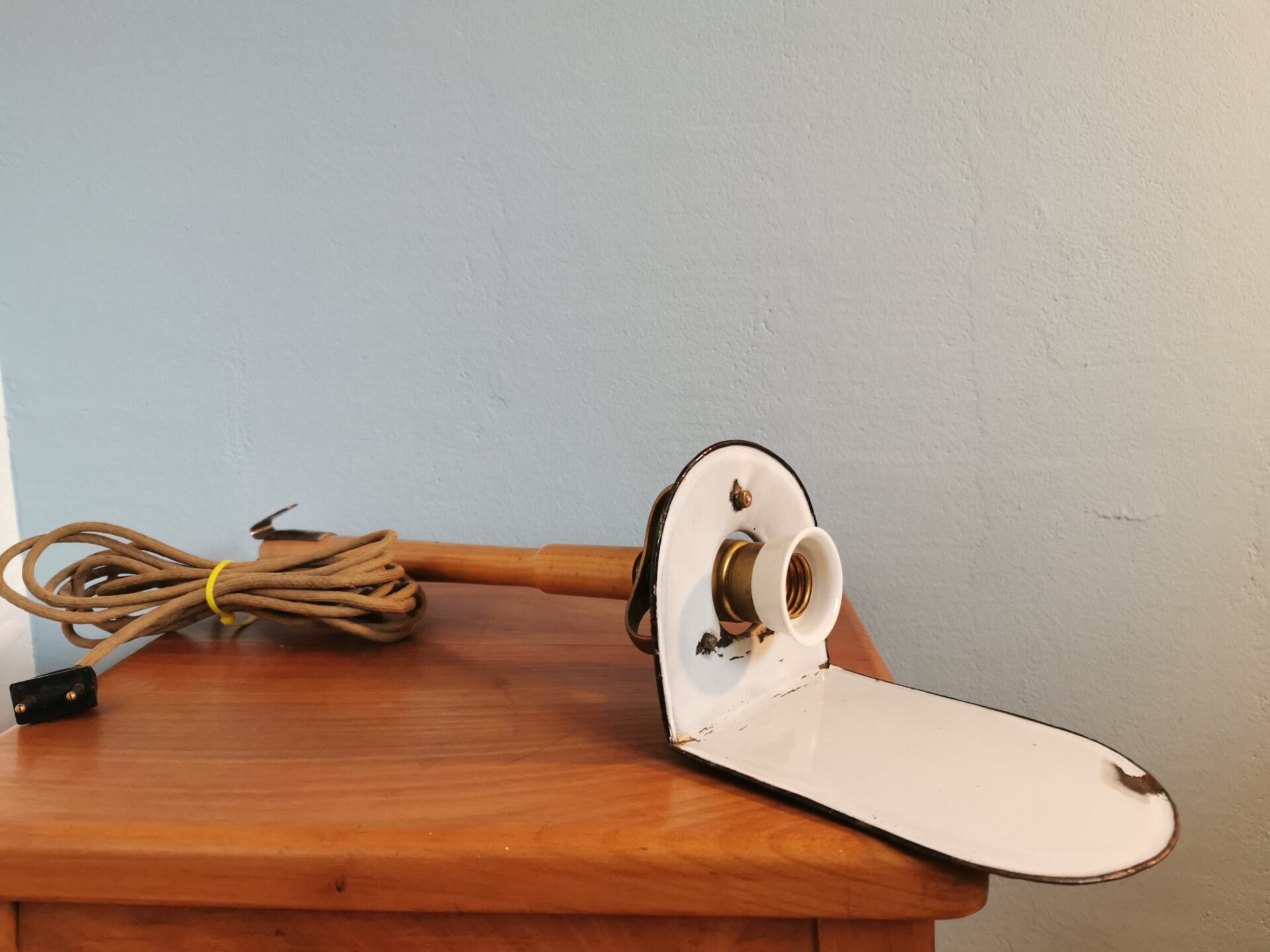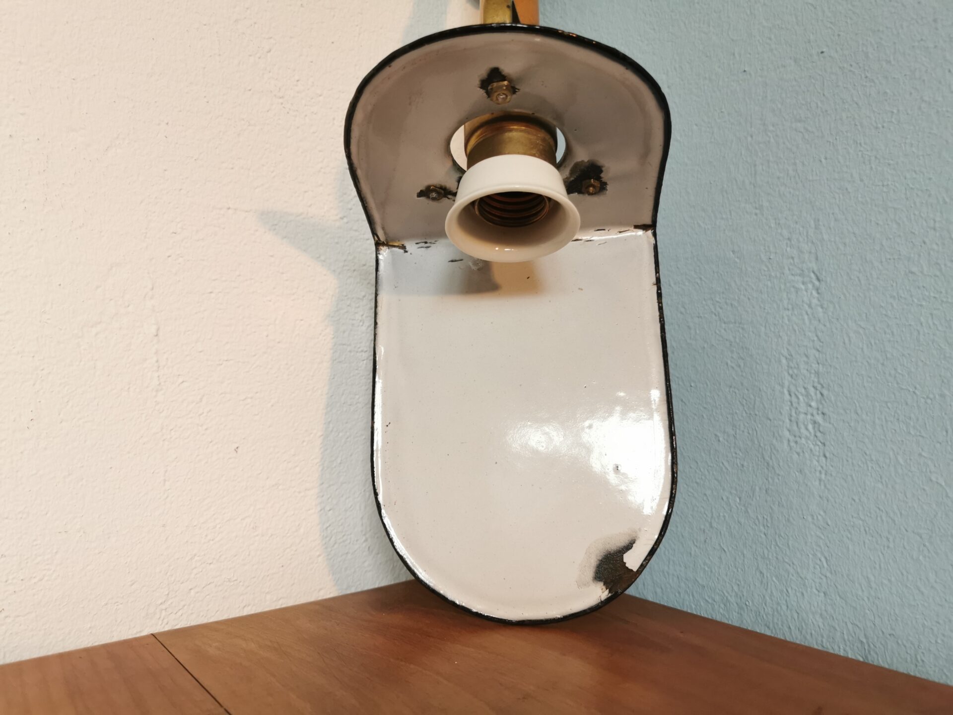 Sehr alte Emaille Hängeleuchte/Messinghalterung/ Porzellanfassung ist am Gewinde-stielseitig angeschlagen, lässt sich aber gut drehen, hält gut, sieht man nicht.