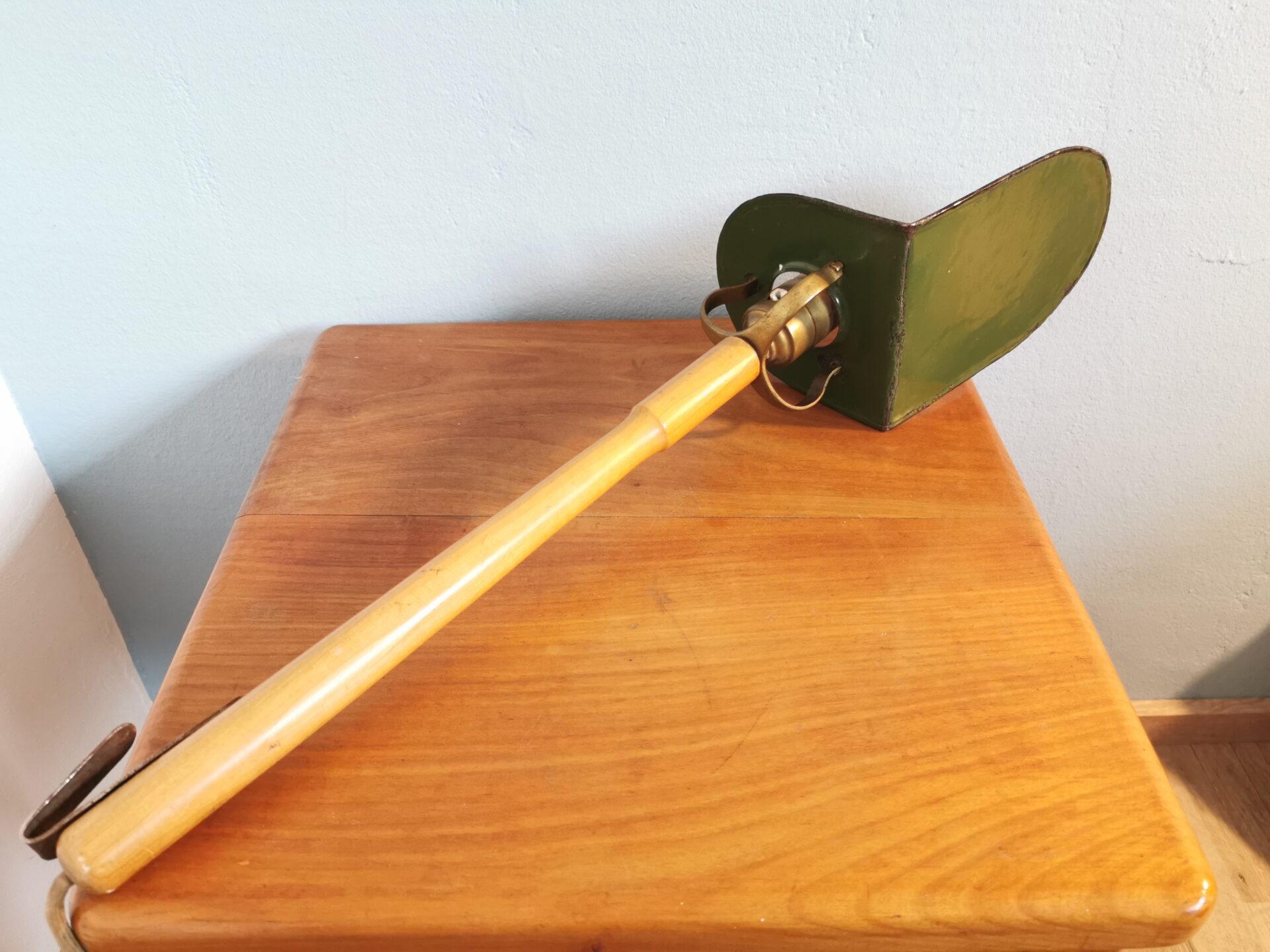 Ein Hacken zum Aufhängen ist am Holzstiel befestigt.